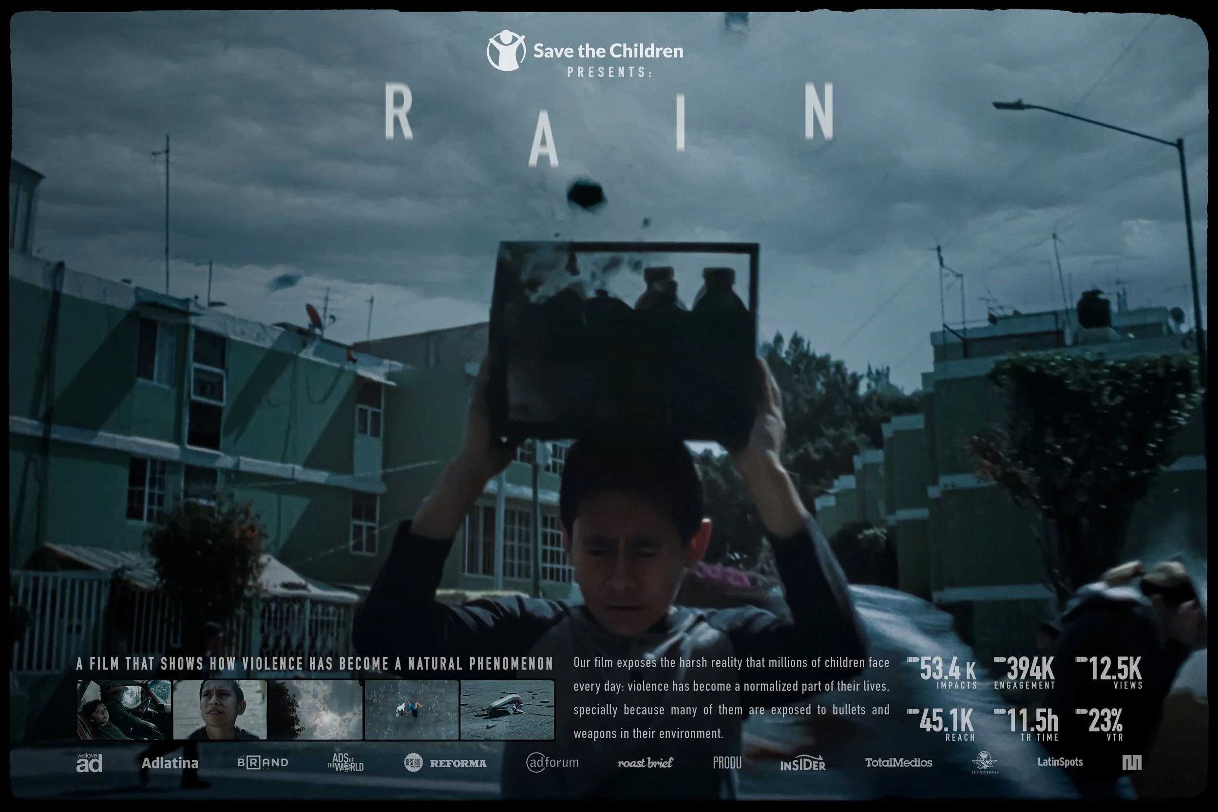 The 2-minute film it is a shocking story that shows how children and adolescents face a terrible environment of violence on a daily basis, one that attacks them like a storm of bullets, and from which they must take shelter to protect their lives, but unfortunately hundreds of them never make it.